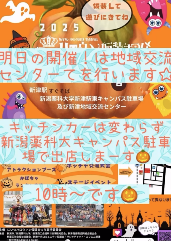 10/26(日)10時〜16時いよいよ今週となりました!!ハッピーハロウィン🎃薬科大新津駅東口 駐車場&地域交流センターにて開催👍本日はステージで演舞していただくスペシャルオリンピックスの